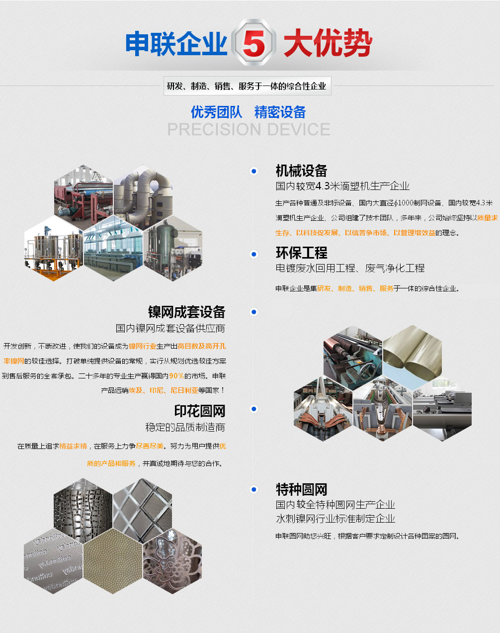 主要產品:機械設備、環保工程、鎳網生產成套設備、印染鎳網、特種鎳網等系列產品的研發、制造、銷售、服務于一體的綜合性企業。